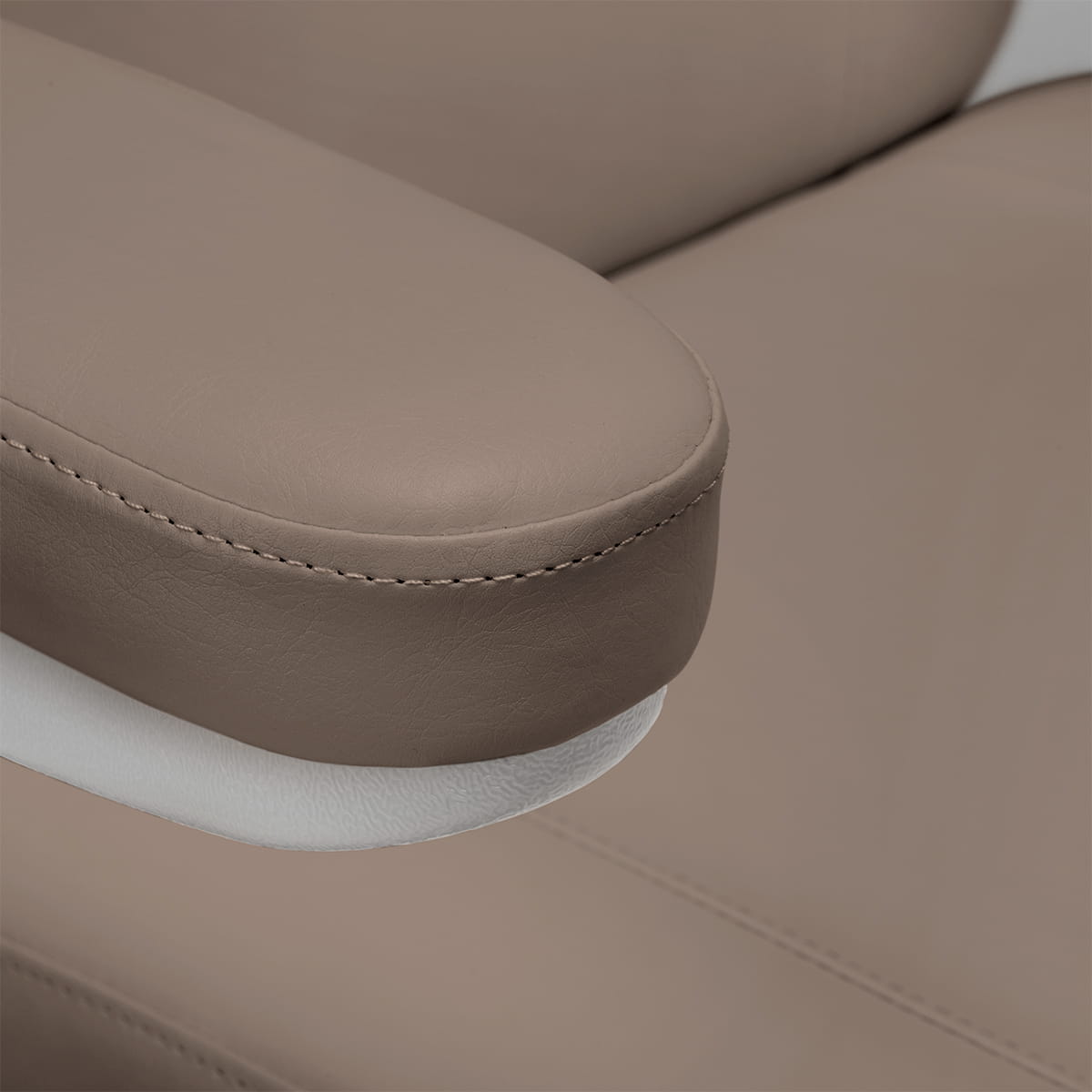 Fotel wypełniony jest wyprofilowaną pianką i pokryty przyjemną w dotyku skórą syntetyczną w odcieniach brązu. Użyty materiał sprawia, że sprzęt jest łatwy w czyszczeniu, a także odporny na wilgoć i wybrane środki dezynfekcji. Solidna podstawa wykonana z trwałego materiału w odcieniach bieli zapewnia stabilność w trakcie zabiegów. Odpowiednio wyprofilowane obszycia nadają fotelowi stylowy wygląd i sprawiają, że siedzisko jest ergonomiczne. Minimalistyczny, prosty design i klasyczna kolorystyka pozwalają mu wpasować się w każde wnętrze.