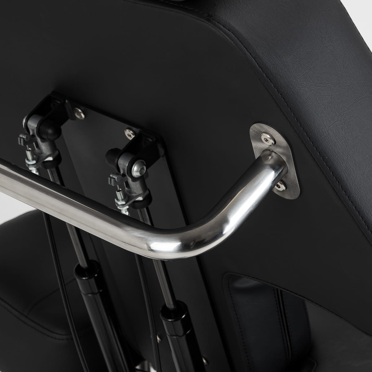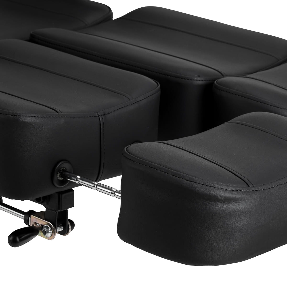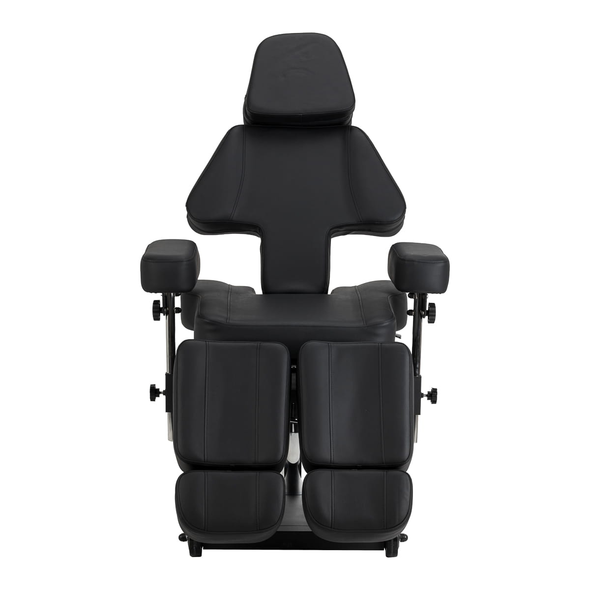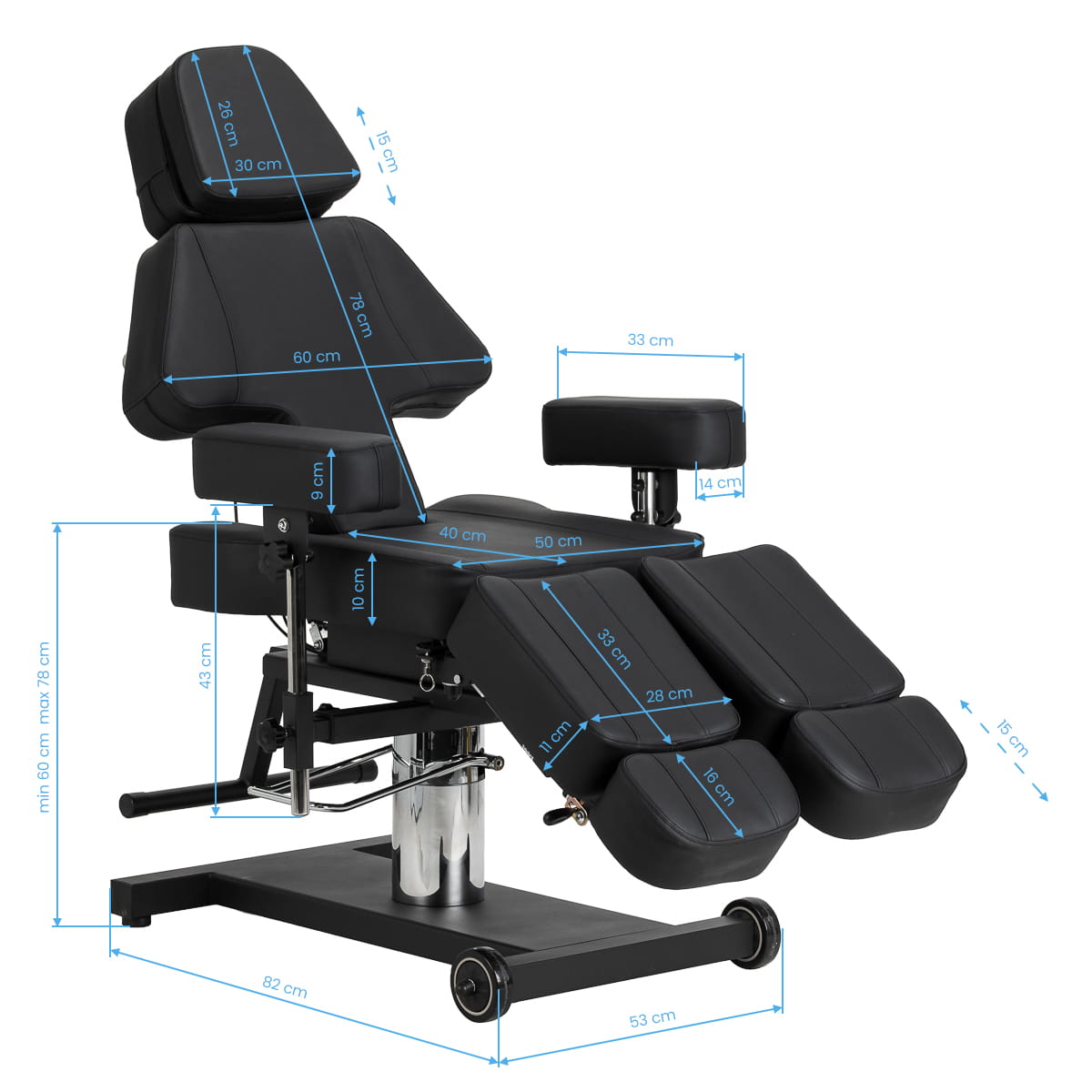 Wysokość siedziska regulowana jest za pomocą siłownika hydraulicznego w zakresie 60-78 cm, natomiast po pełnym rozłożeniu fotel osiąga długość do 200 centymetrów. Manualne ustawienie kąta nachylenia oparcia i podnóżków pozwala dostosować pozycję do specyfiki wykonywanego zabiegu. Dzielony podnóżek z niezależną regulacją segmentów oraz regulacją boczną umożliwia indywidualne ułożenie nóg, zwiększając swobodę pracy oraz komfort klienta. Wysuwana część podnóżka zapewnia stabilne podparcie także osobom o wyższym wzroście. Demontowalne podłokietniki z regulacją wysokości i kąta zwiększają możliwości ustawienia, co ułatwia dopasowanie fotela do aktualnych potrzeb. Całość tworzy ergonomiczne i funkcjonalne rozwiązanie, idealnie dopasowane do realiów pracy w profesjonalnym studiu tatuażu.