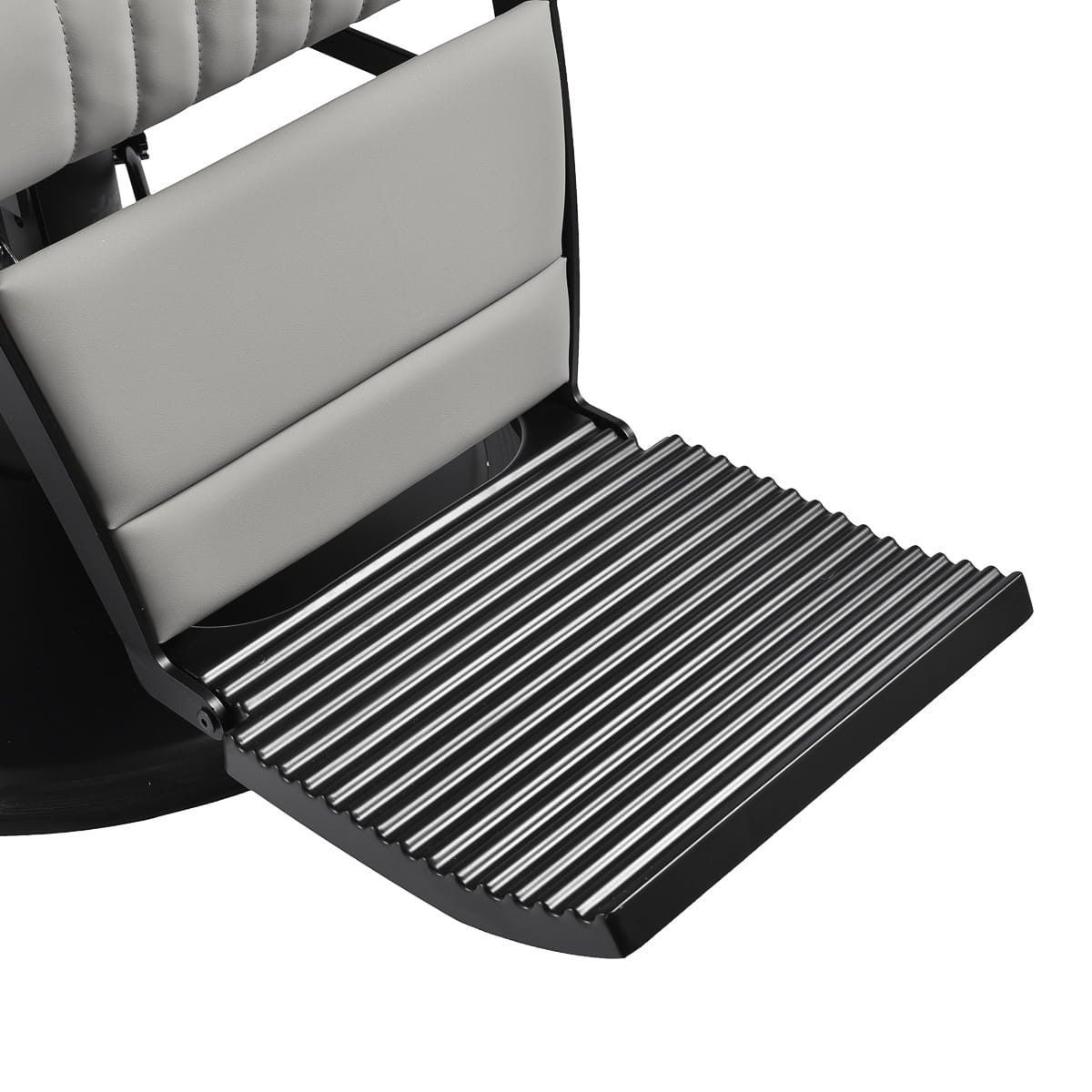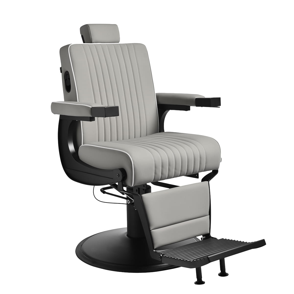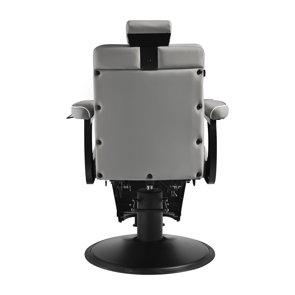 Czarna, okrągła podstawa zapewnia stabilność oraz trwałość użytkowania. Obicie z miękkiej, matowej skóry syntetycznej łączy komfort z wytrzymałością. Zastosowane materiały są odporne na wilgoć, trwałe i łatwe w czyszczeniu. Stylowe przeszycia i tapicerka w odcieniach szarości nadają mu wyjątkowego charakteru, idealnie komponującego się z wystrojem nowoczesnych salonów barberskich. Połączenie eleganckiego odcienia obicia z czarną ramą i podstawą podkreśla nowoczesny, profesjonalny wygląd fotela.