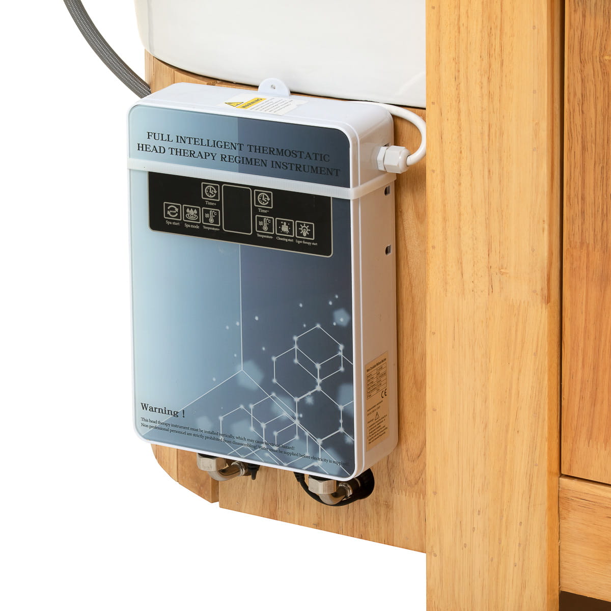 Intuicyjny panel dotykowy umożliwia pełną kontrolę nad parametrami zabiegu, zapewniając wygodę użytkowania. Umożliwia regulację czasu pracy i temperatury wody oraz bieżące monitorowanie ustawień. Panel pozwala również na włączenie światłoterapii – podświetlenie misy, które tworzy atmosferę relaksu i podkreśla luksusowy charakter zabiegu. Dodatkowo, urządzenie do terapii parowej wyposażone jest w pilota umożliwiającego wygodną obsługę na odległość.