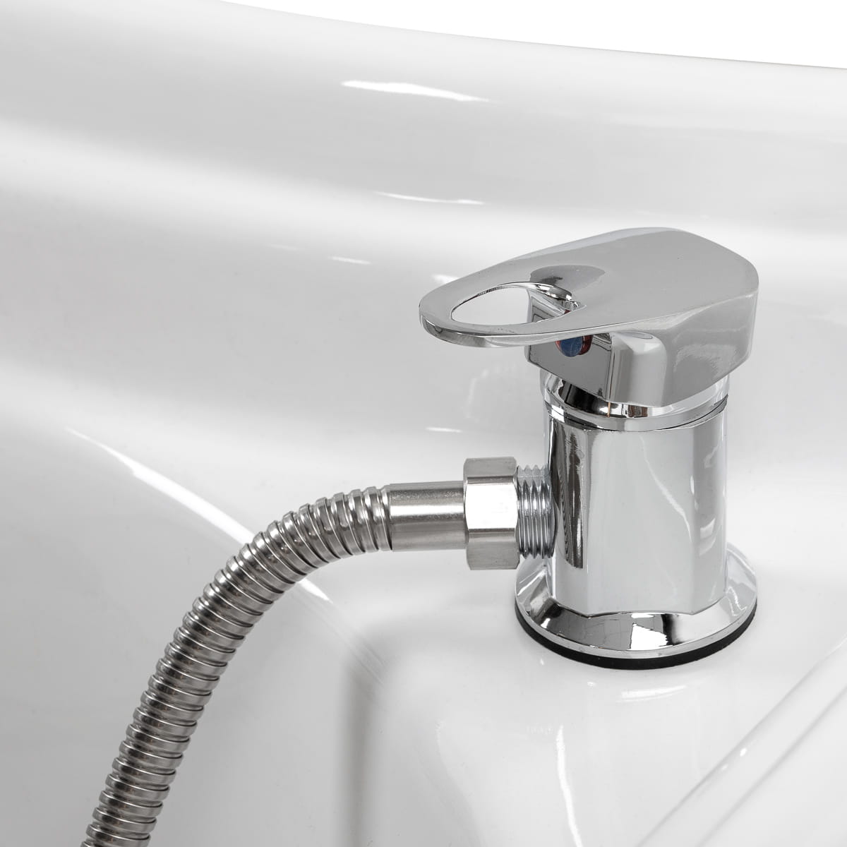 Myjnia jest wyposażona w baterię z mieszaczem, co umożliwia łatwe dopasowanie temperatury do preferencji klienta. Praktyczne miejsce na słuchawkę natryskową ułatwia pracę, a korek ze specjalnym sitkiem pozwala na kontrolę przepływu wody oraz utrzymanie wysokich standardów higieny w salonie. Przyłącze wody umieszczono wewnątrz pod misą oraz z tyłu pod brodzikiem, co pozwala estetycznie ukryć instalacje. Ergonomicznie wyprofilowana leżanka zapewnia wygodę i odpowiednie podparcie podczas zabiegów, a dołączona do zestawu pufa zwiększa komfort pracy personelu. Połączenie funkcjonalności i udogodnień sprawia, że myjnia staje się wszechstronnym wyposażeniem zarówno salonów fryzjerskich, jak i gabinetów SPA.