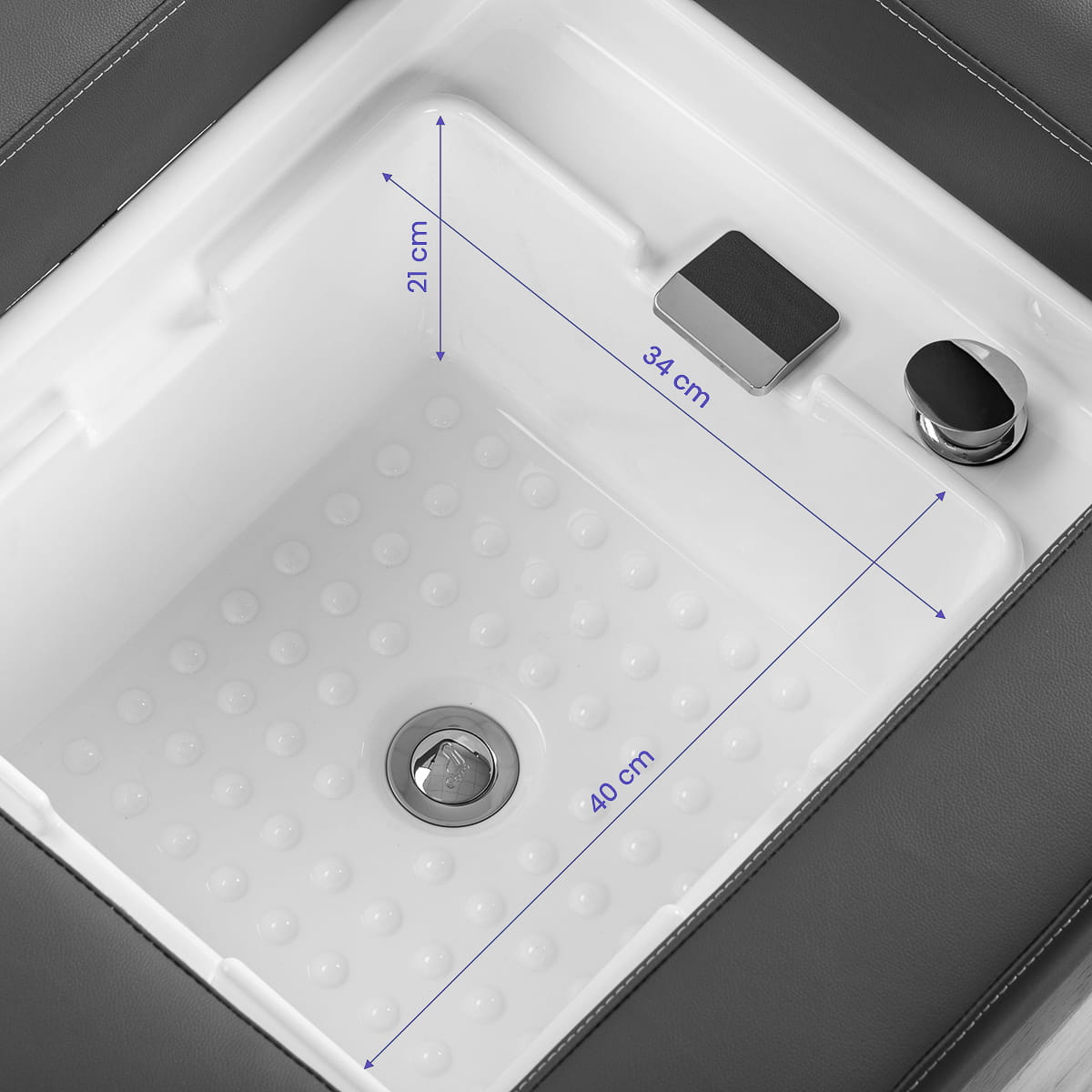 Regulowany podgłówek z możliwością wysuwania i zmiany kąta nachylenia zapewnia idealne dopasowanie do potrzeb użytkownika, zwiększając komfort podczas zabiegów. W zestawie znajdują się ergonomiczne poduszki, w tym zagłówek z otworem na twarz, który umożliwia wykonywanie nie tylko procedur pielęgnacyjnych skóry głowy, ale również masaży oraz różnorodnych zabiegów na ciało i twarz. Wbudowany brodzik poszerza funkcjonalność leżanki, umożliwiając przeprowadzanie zabiegów pielęgnacyjnych stóp, w tym pedicure. To rozwiązanie dodatkowo wzmacnia poczucie relaksu i pozwala na jeszcze bardziej kompleksową ofertę usług. Dzięki tym praktycznym elementom leżanka staje się uniwersalnym wyposażeniem salonów beauty & wellness, gwarantując zarówno wygodę klienta, jak i efektywność wykonywanych zabiegów.