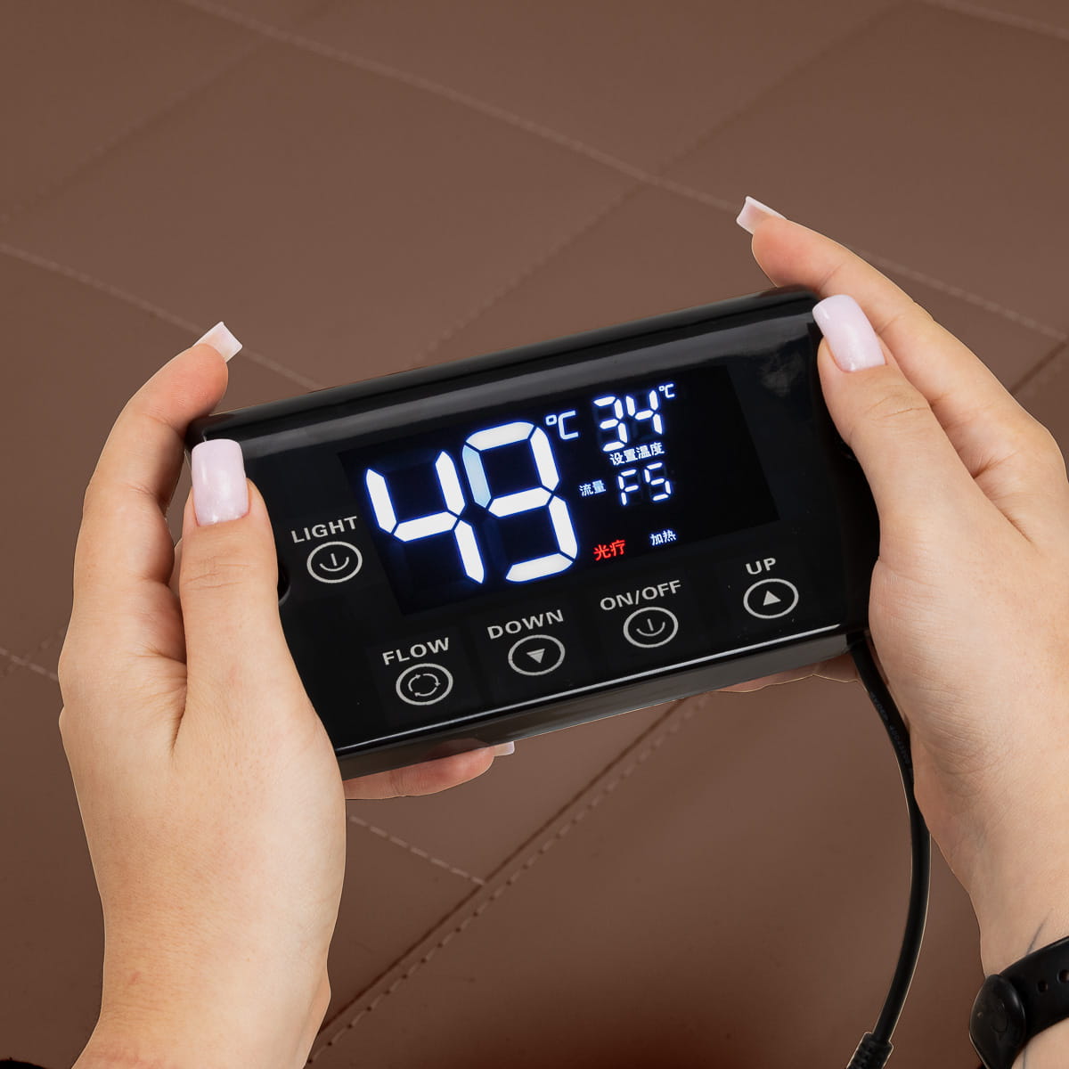 Intuicyjny panel dotykowy umożliwia pełną kontrolę nad parametrami zabiegu i wygodę obsługi. Umożliwia regulację temperatury wody, a także monitorowanie jej aktualnych wartości na wyraźnym, czytelnym wyświetlaczu. Dodatkowo panel pozwala uruchomić funkcję światłoterapii, czyli podświetlenia misy, które buduje atmosferę relaksu i luksusu. Zestaw uzupełnia pilot, umożliwiający wygodne sterowanie urządzeniem do terapii parowej na odległość.