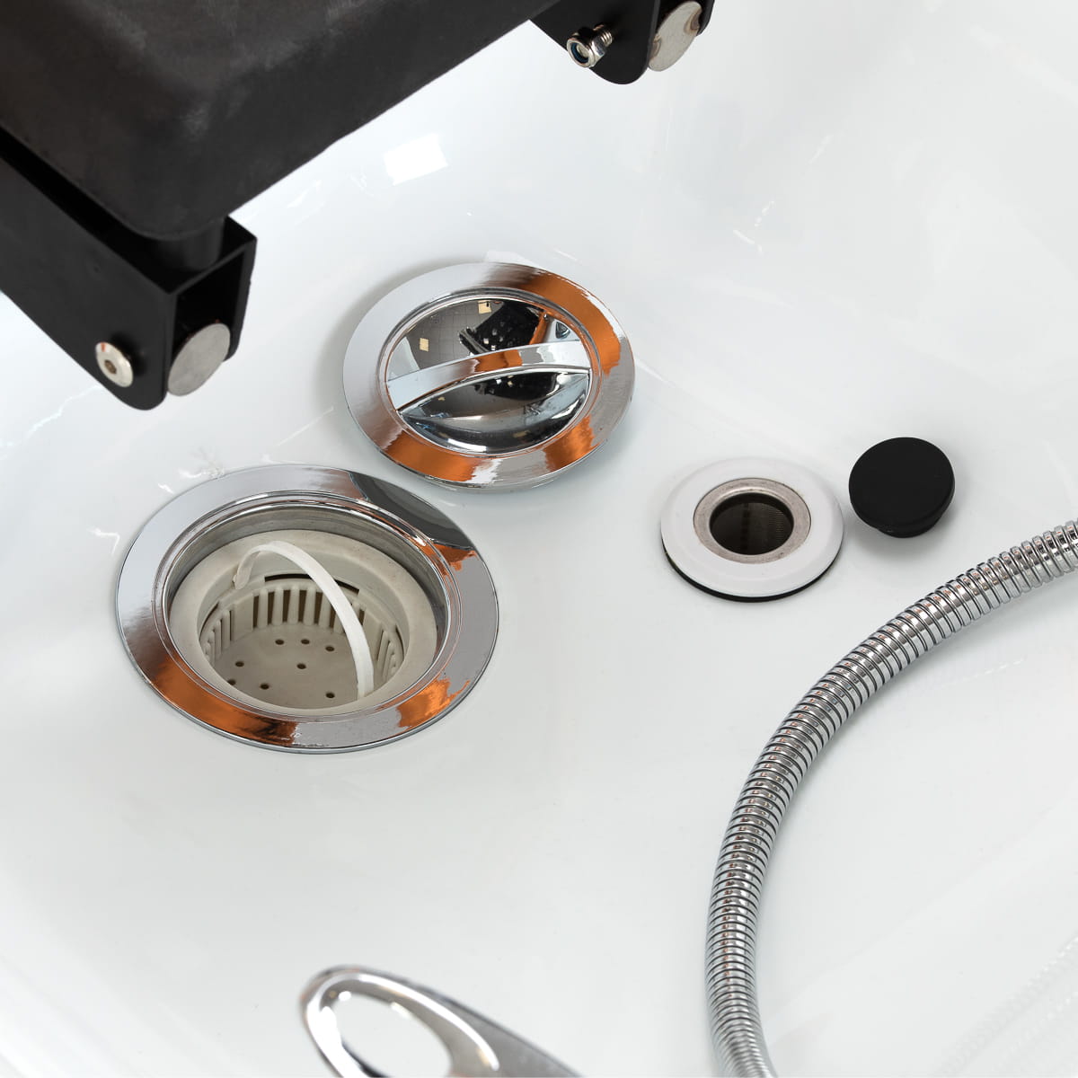 Myjnia została wyposażona w baterię z mieszaczem, umożliwiającą precyzyjne dopasowanie temperatury wody do potrzeb klienta. Dedykowane miejsce na słuchawkę natryskową usprawnia pracę, a chromowany korek ze specjalnym sitkiem zapewnia kontrolę przepływu wody i utrzymanie wysokiego poziomu higieny. Przyłącze wodne umieszczono wewnątrz podstawy za materiałem, co pozwala ukryć instalację i nadaje całości elegancki wygląd. Ergonomiczne wyprofilowanie leżanki gwarantuje komfort podczas różnych zabiegów pielęgnacyjnych. Całość dopełnia praktyczna pufa, zwiększająca wygodę pracy personelu i podnosząca funkcjonalność zestawu. Dzięki tym rozwiązaniom myjnia doskonale sprawdza się zarówno w salonach fryzjerskich, jak i gabinetach SPA.
