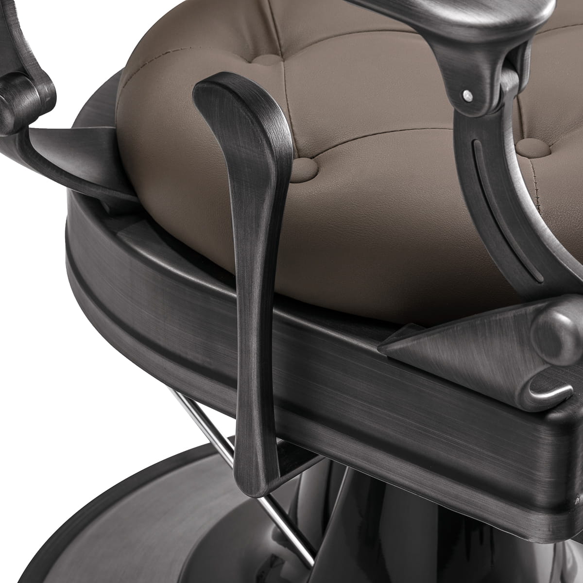 Solidna konstrukcja podstawy zapewnia stabilność oraz wysoki komfort użytkowania. Wypełnienie siedziska z trwałej, odpornej na odkształcenia pianki oraz obicie wykonane z przyjemnej w dotyku skóry syntetycznej o matowym wykończeniu zapewniają trwałość mebla oraz jego komfortowe użytkowanie przez długi czas. Zastosowane materiały sprawiają również, że sprzęt jest odporny na wilgoć, wytrzymały oraz łatwy do czyszczenia. Pokrycie w odcieniach brązu z pikowaniem i ozdobnymi guzikami oraz zdobiony podnóżek nadają mu wyjątkowego charakteru. Fotel o charakterystycznym designie, nawiązującym do stylu vintage, doskonale pasuje do klimatu salonów barberskich, podkreślając ich wyjątkową atmosferę.