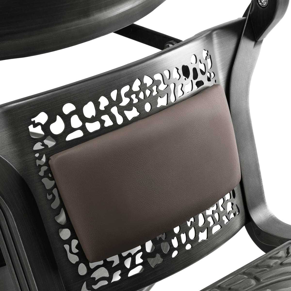 Komfortowe siedzisko wypełnione pianką gwarantuje klientowi wygodę w trakcie różnorodnych usług. Wyprofilowane oparcie pozwala na zajęcie dogodnej pozycji, zapewniając doskonałe wsparcie pleców, co jest istotne szczególnie podczas dłuższych zabiegów. Wyposażenie fotela w mechanizm pełnego obrotu sprawia, że praca staje się bardziej efektywna i wygodna. Tapicerowane podłokietniki umieszczone na odpowiedniej wysokości umożliwiają prawidłowe ułożenie barków klienta – sprawia to, że nie chowa głowy w ramionach ani się nie garbi – znacząco ułatwiając wykonywanie precyzyjnych zabiegów. Uchwyt na ręcznik pod podłokietnikiem znacznie wpływa na efektywność pracy. Otwór pomiędzy oparciem a siedziskiem ułatwia zachowanie czystości w salonie, pozwalając w łatwy sposób wymieść włosy z każdego zakamarka fotela. Usprawnia to przygotowanie stanowiska pracy pomiędzy klientami.