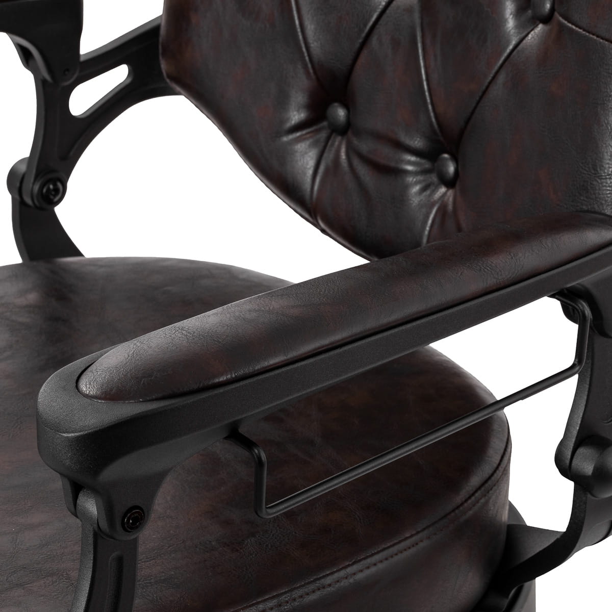 Solidna konstrukcja podstawy zapewnia stabilność oraz wysoki komfort użytkowania. Wypełnienie siedziska z trwałej, odpornej na odkształcenia pianki oraz obicie wykonane z przyjemnej w dotyku skóry syntetycznej o półmatowym wykończeniu zapewniają trwałość mebla i jego komfortowe użytkowanie przez długi czas. Sprawiają również, że sprzęt jest odporny na wilgoć, wytrzymały oraz łatwy do czyszczenia. Pokrycie w odcieniach brązu z pikowaniem i ozdobnymi guzikami nadaje mu wyjątkowego charakteru. Fotel o charakterystycznym designie, nawiązującym do stylu vintage, doskonale wpasowuje się w klimat salonów barberskich, podkreślając ich wyjątkową atmosferę.