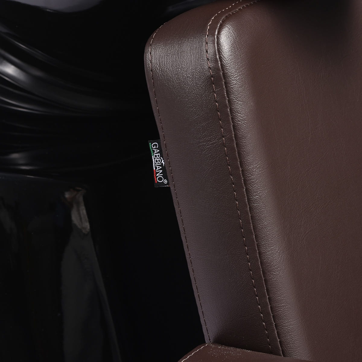 Minimalistyczny fotel o charakterystycznie zaokrąglonym siedzisku łączy prostotę formy z wysokim komfortem użytkowania. Oparcie o optymalnym kącie nachylenia wspiera naturalną pozycję ciała. Tapicerka wykonana z wysokiej jakości skóry syntetycznej w odcieniach brązu jest odporna na zużycie i łatwa do utrzymania w czystości. Nowoczesna linia mebla podkreśla elegancki charakter myjni oraz doskonale komponuje się z wystrojem salonu. W zestawie znajduje się kompletna armatura o matowym wykończeniu w odcieniach czerni, w tym bateria, słuchawka prysznicowa oraz dedykowane węże, aby zapewnić całkowity zestaw narzędzi do pracy.