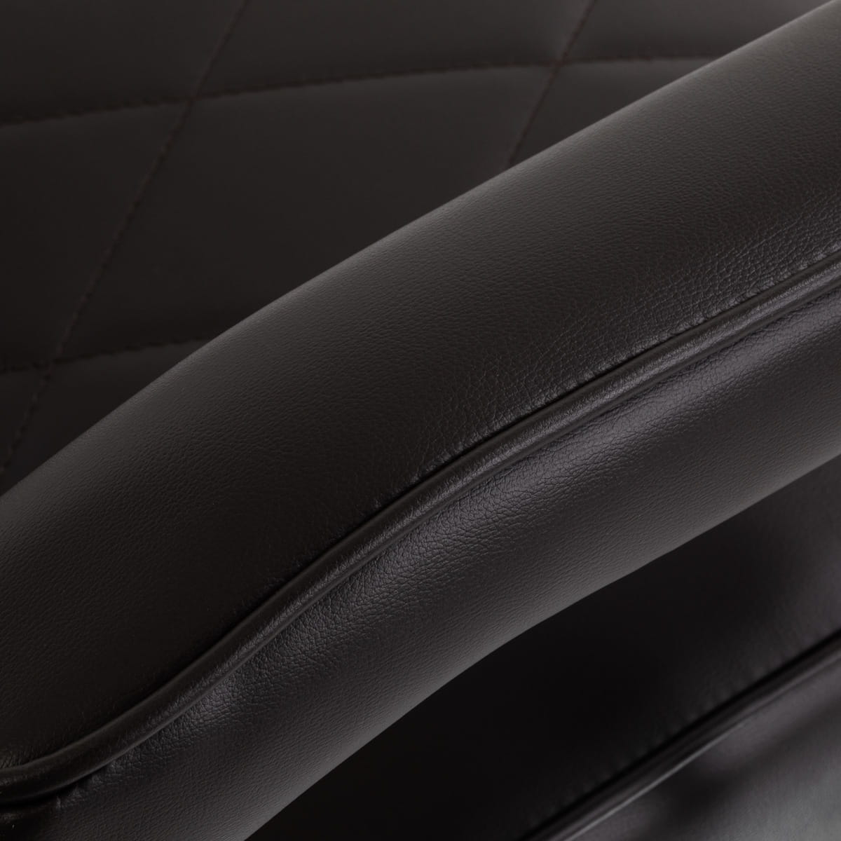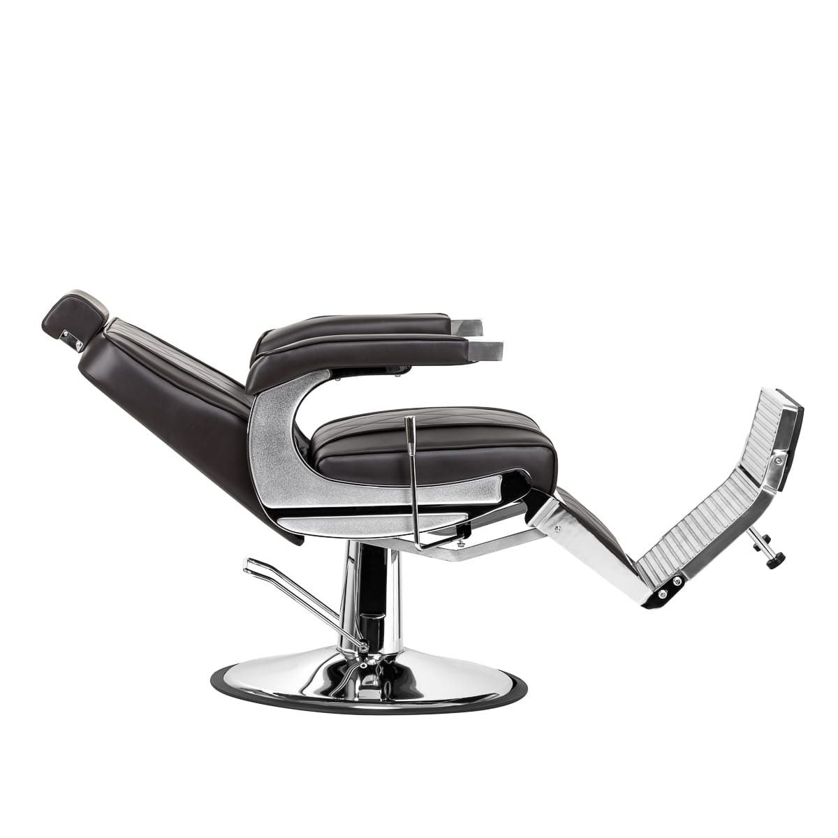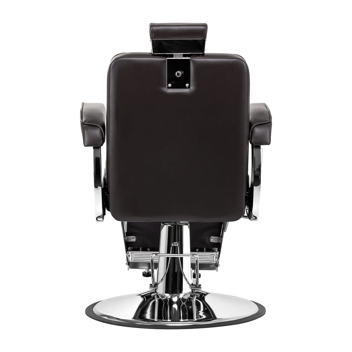 Solidna konstrukcja okrągłej podstawy zapewnia stabilność oraz wysoki komfort użytkowania. Wypełnienie siedziska z odpornej na odkształcenia pianki oraz obicie wykonane z przyjemnej w dotyku skóry syntetycznej o matowym wykończeniu zapewniają trwałość mebla oraz jego komfortowe użytkowanie przez długi czas. Stylowe przeszycia na tapicerce nadają fotelowi charakteru, przywodząc na myśl design motoryzacyjny, co podkreśla jego elegancki wygląd. Sprawiają również, że sprzęt jest odporny na wilgoć, wytrzymały oraz łatwy do czyszczenia. Pokrycie w odcieniach brązu nadaje mu wyjątkowego charakteru, a minimalistyczny styl pozwala mu wpasować się w wystrój każdego salonu barberskiego.