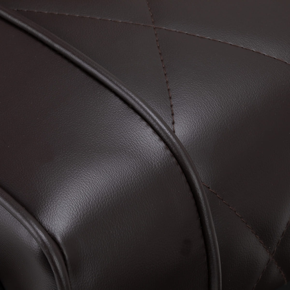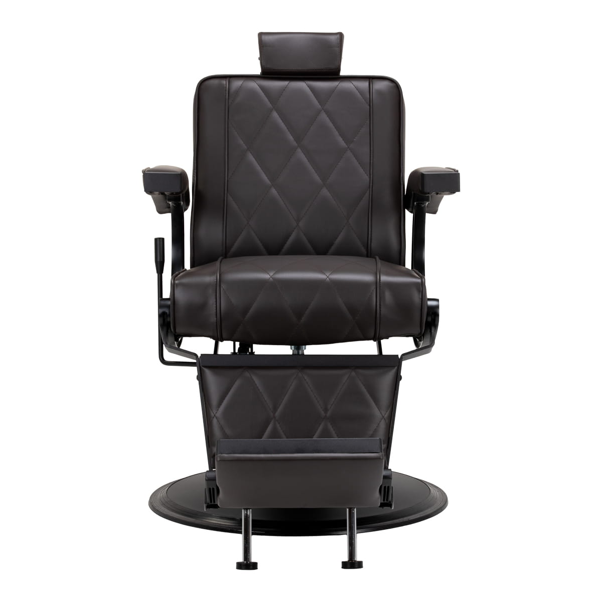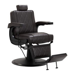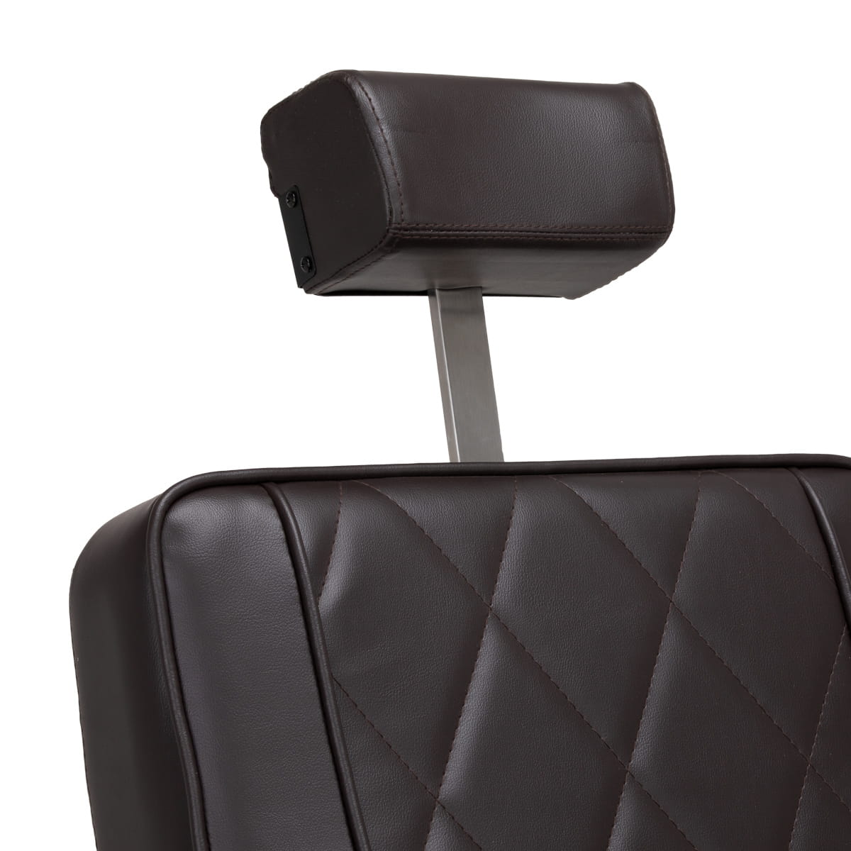 Solidna konstrukcja okrągłej podstawy zapewnia stabilność oraz wysoki komfort użytkowania. Wypełnienie siedziska z odpornej na odkształcenia pianki oraz obicie wykonane z przyjemnej w dotyku skóry syntetycznej o matowym wykończeniu zapewniają trwałość mebla oraz jego komfortowe użytkowanie przez długi czas. Stylowe przeszycia na tapicerce nadają fotelowi charakteru, przywodząc na myśl design motoryzacyjny, co podkreśla jego elegancki wygląd. Sprawiają również, że sprzęt jest odporny na wilgoć, wytrzymały oraz łatwy do czyszczenia. Pokrycie w odcieniach brązu nadaje mu wyjątkowego charakteru, a minimalistyczny styl pozwala mu wpasować się w wystrój każdego salonu barberskiego.