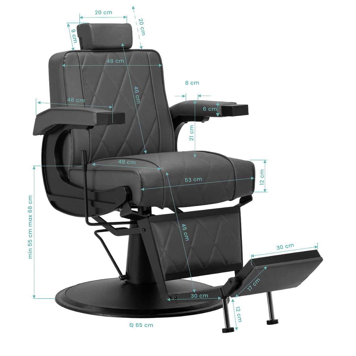 Wydajny podnośnik hydrauliczny umożliwia swobodną regulację wysokości siedziska w granicach 55-68 cm, nawet w momencie, gdy klient zajmie już miejsce w fotelu. Gwarantuje to ergonomiczną pracę i ułatwia dopasowanie poziomu siedziska do wzrostu zarówno klienta, jak i osoby wykonującej zabieg. Fotel posiada odchylane oparcie oraz regulowany podnóżek, dzięki czemu możliwe jest ułożenie klienta w dogodnej, półleżącej pozycji. Takie ustawienie gwarantuje lepszy dostęp podczas niektórych usług. Dodatkowo wysuwany o 20 cm zagłówek zapewnia doskonałe podparcie głowy.