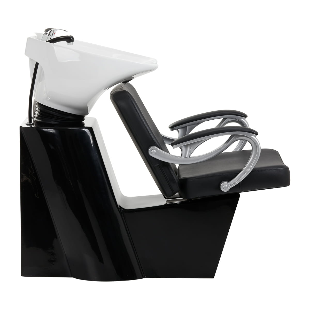 Odpowiednio wyprofilowany fotel wypełniony trwałą pianką zapewnia wysoki komfort użytkowania, a ciekawie wygięte, częściowo tapicerowane podłokietniki pozwalają na prawidłowe ułożenie barków klienta i są atrakcyjnym wizualnie elementem. Wygodne oparcie pozwala na zajęcie odpowiedniej pozycji i zapewnia wsparcie pleców. Pokrycie w odcieniach czerni oraz ozdobne powierzchnie metalowe lakierowane w barwach złota nadają mu wyraz ponadczasowej elegancji, a dodatkowo gwarantują wieloletnią wytrzymałość oraz łatwość czyszczenia. Oryginalny wygląd myjni nadaje wnętrzom niepowtarzalnego wyrazu. W zestawie znajduje się kompletna armatura, w tym bateria, słuchawka prysznicowa oraz dedykowane węże, aby zapewnić całkowity zestaw narzędzi do pracy.