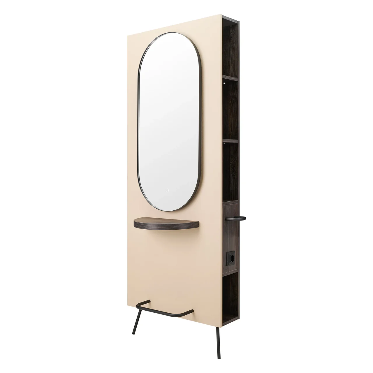 Duża konsola fryzjerska na metalowych nóżkach łącząca styl skandynawski ze stylem art deco