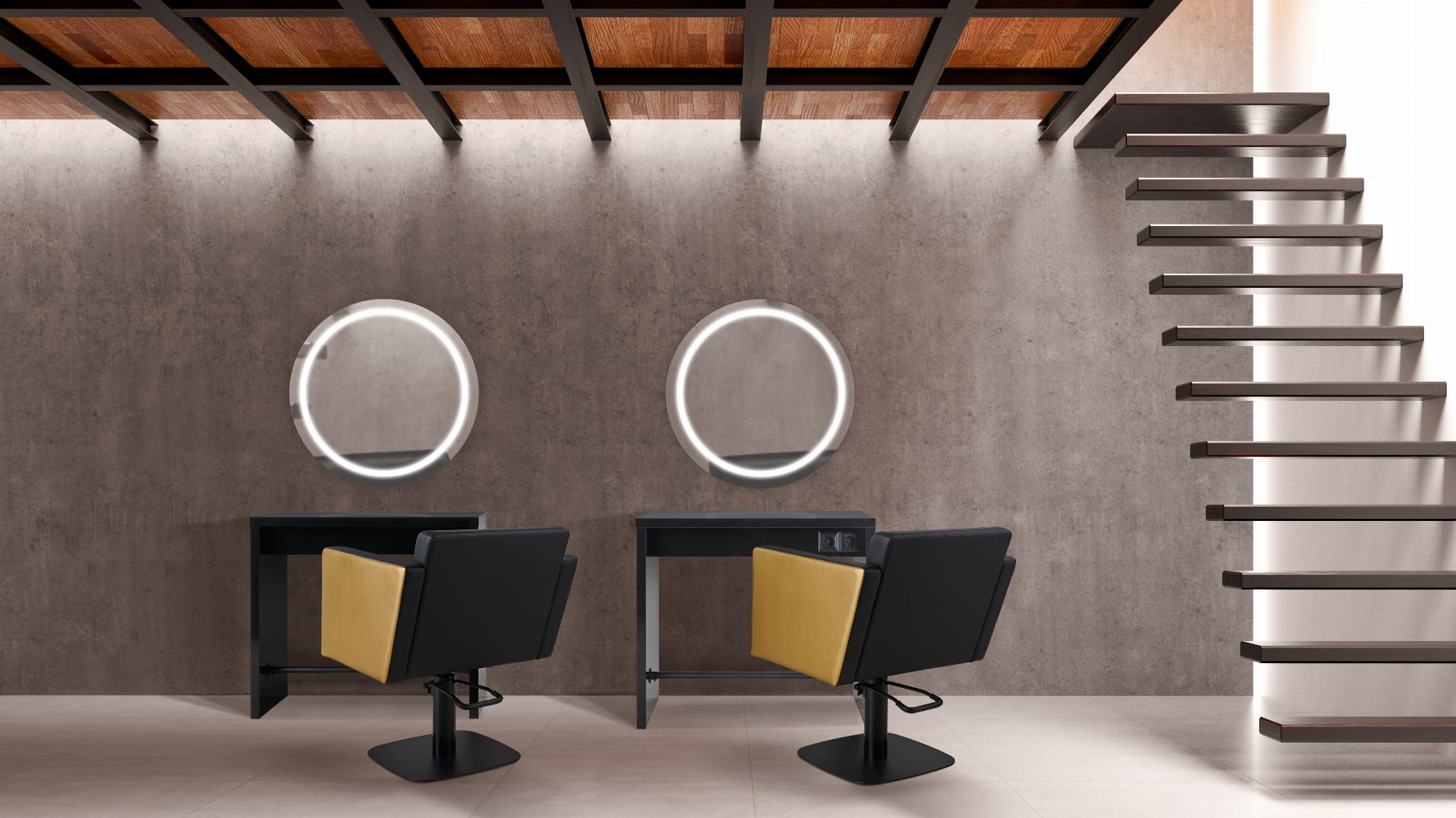 Modna, podwójna konsola fryzjerska typu wyspa z okrągłymi lustrami