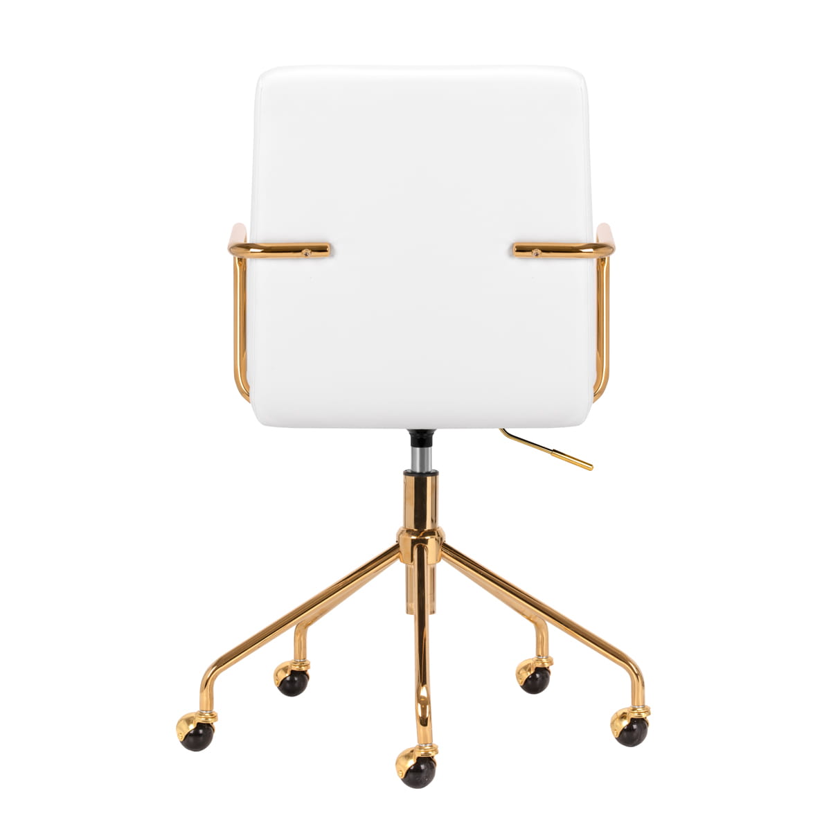 Przyjemne w dotyku, obicie ze skóry syntetycznej w odcieniach bieli nadaje meblowi wyjątkowego charakteru. Eleganckie wykończenie sprawia, że mebel przykuwa wzrok. Stelaż w odcieniach złota dodaje elegancji, idealnie komponując się z prostymi kształtami. Funkcjonalne kółka zapewniają znaczną mobilność, ułatwiając przestawianie krzesła oraz poruszanie się po salonie w trakcie pracy. Estetyka wykonania, komfort użytkowania oraz ergonomicznie wyprofilowane oparcie sprawiają, że krzesło spełni wymagania nawet najbardziej wymagających użytkowników.