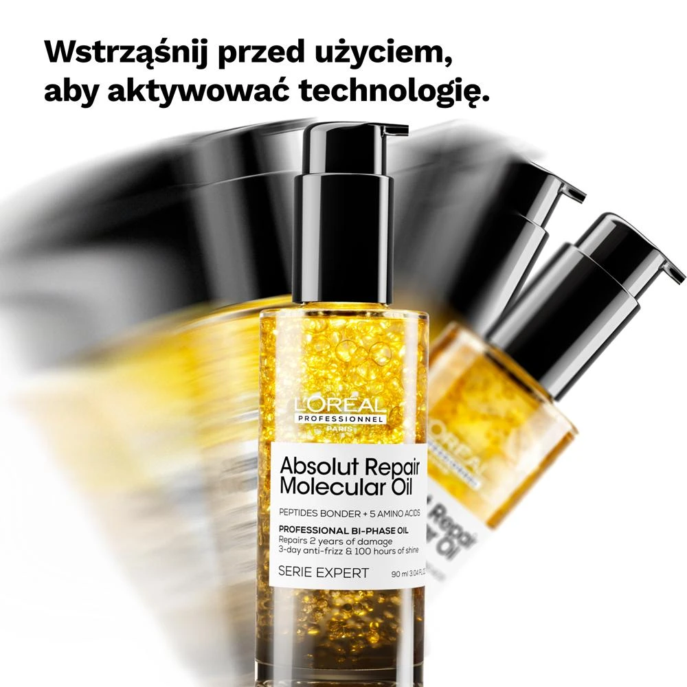 L'Oréal Absolut Repair Molecular Bi-Phase Oil to profesjonalny, dwufazowy olejek odbudowujący, który wnika w głąb włosa i działa na poziomie molekularnym. Zaawansowana i opatentowana formuła łączy fazę wodną oraz olejową, zapewniając intensywną regenerację, odbudowę oraz spektakularny blask. Produkt pozostawia włosy miękkie, wygładzone i pełne zdrowego, świetlistego wykończenia – bez efektu obciążenia.