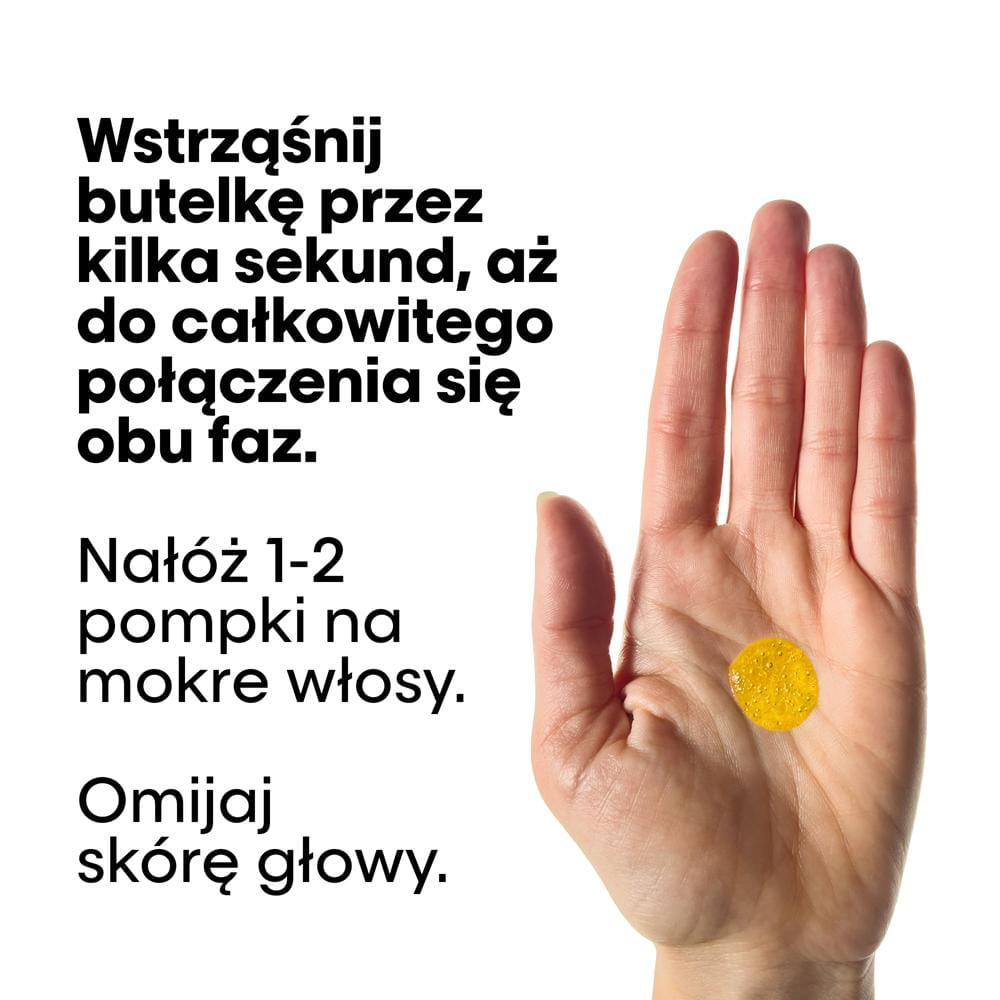 Sposób użycia: Dobrze wstrząśnij butelkę przez kilka sekund, aż fazy całkowicie się połączą. Nabierz 1–2 pompki, rozgrzej w dłoniach i nałóż na wilgotne lub suche włosy, omijając nasadę. Nie spłukuj.