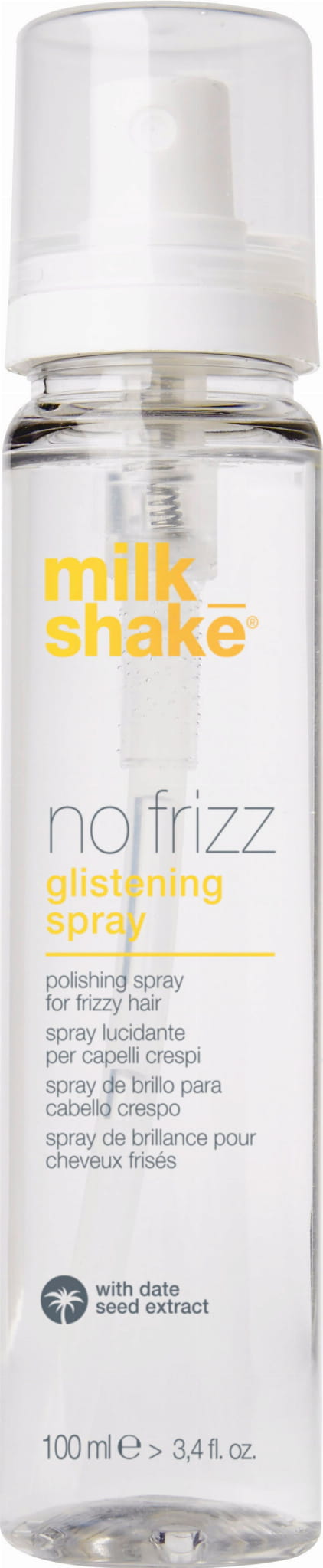 Milk Shake No Frizz Glistening Spray to nabłyszczający spray stworzony specjalnie dla osób zmagających się z puszącymi się włosami. Jego unikalna formuła eliminuje elektryzowanie się włosów, poprawia ich podatność na układanie oraz nadaje im zdrowy, naturalny blask. Dzięki zawartości ekstraktu z pestek daktyli i oleju abisyńskiego, spray zapewnia włosom gładkość oraz pomaga utrzymać optymalny poziom nawilżenia.