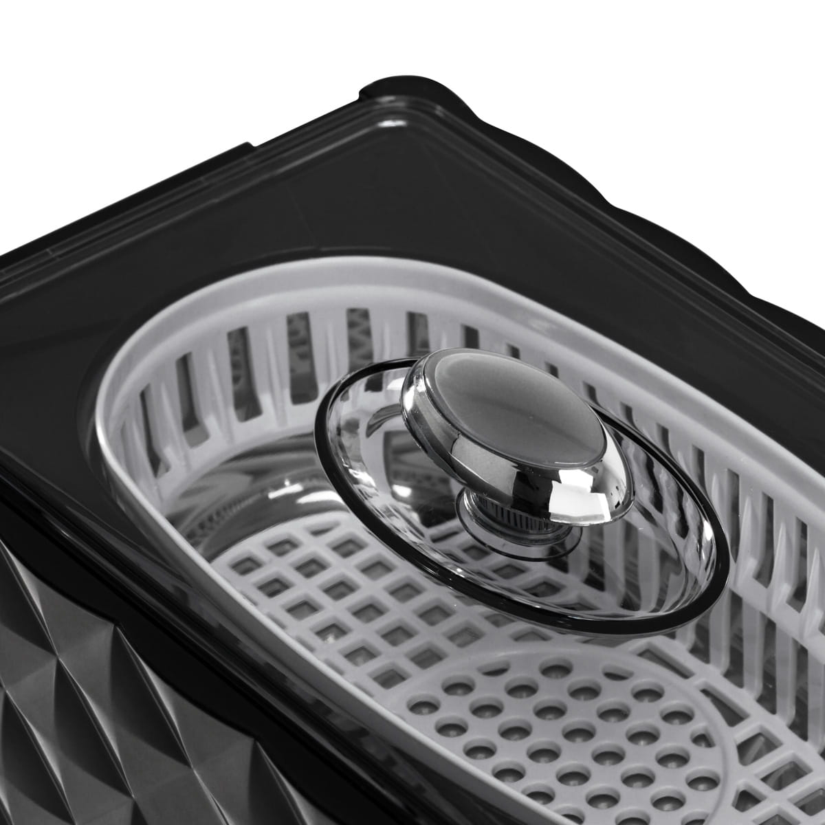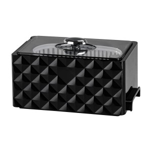 Niewielkie gabaryty sprawiają, że ta myjka ultradźwiękowa jest bardzo prosta w transporcie, a dodatkowo nie zajmuje zbyt wiele miejsca w salonie. Estetyczna, zdobiona obudowa wykonana jest z tworzywa sztucznego w odcieniach czerni, a przejrzysta pokrywa pozwala na bieżąco obserwować przebieg procesu i nie utrudnia włączenia urządzenia, mimo że guzik ukryty jest pod nią. Pojemnik ma we wnętrzu oznaczenie maksymalnego napełnienia płynem (do 300 ml). Stabilność urządzenia zapewniają antypoślizgowe stopki.