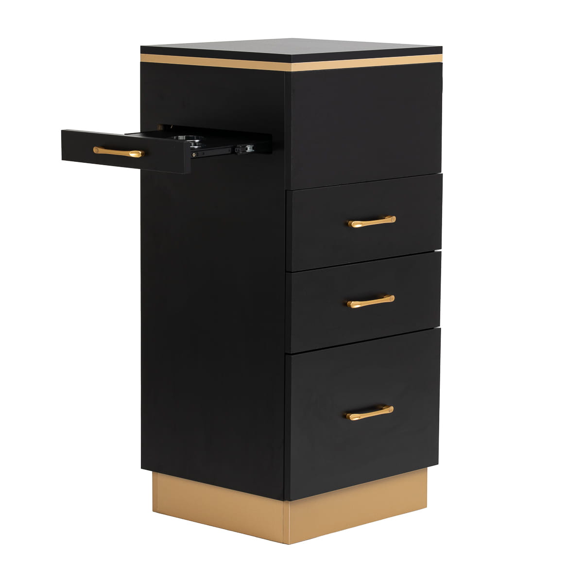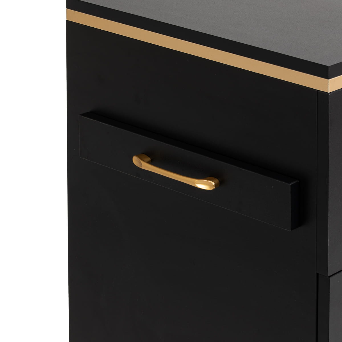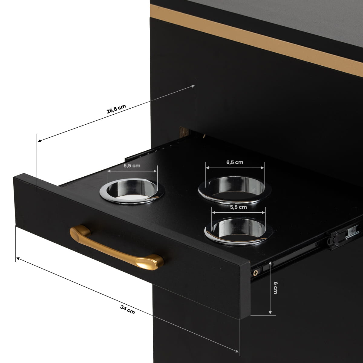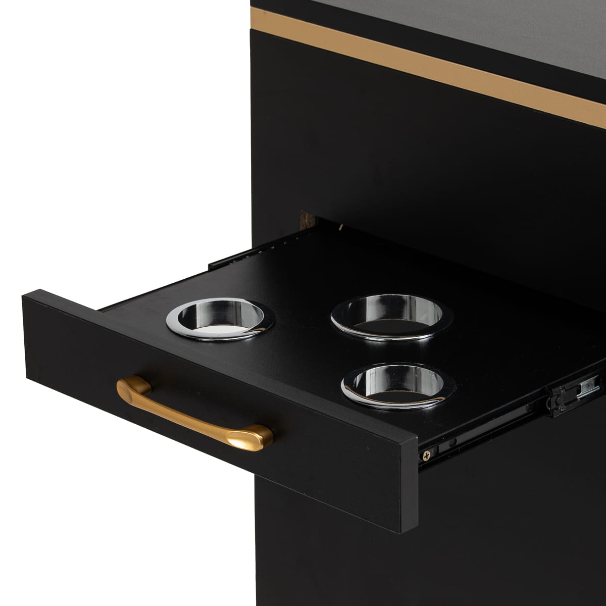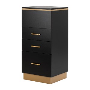 Zestawienie klasycznej czerni ze złotem nadaje pomocnikowi nowoczesnego, prestiżowego charakteru, który świetnie dopasuje się zarówno do minimalistycznych, jak i bardziej wyrazistych aranżacji. Solidna konstrukcja zapewnia stabilność, a gładka powierzchnia ułatwia utrzymanie mebla w czystości. Złote uchwyty nie tylko podkreślają elegancki design, ale także zapewniają wygodne otwieranie każdej z szuflad. To praktyczne rozwiązanie do salonu fryzjerskiego, w którym liczy się porządek, wygodny dostęp do narzędzi oraz estetyka stanowiska pracy.