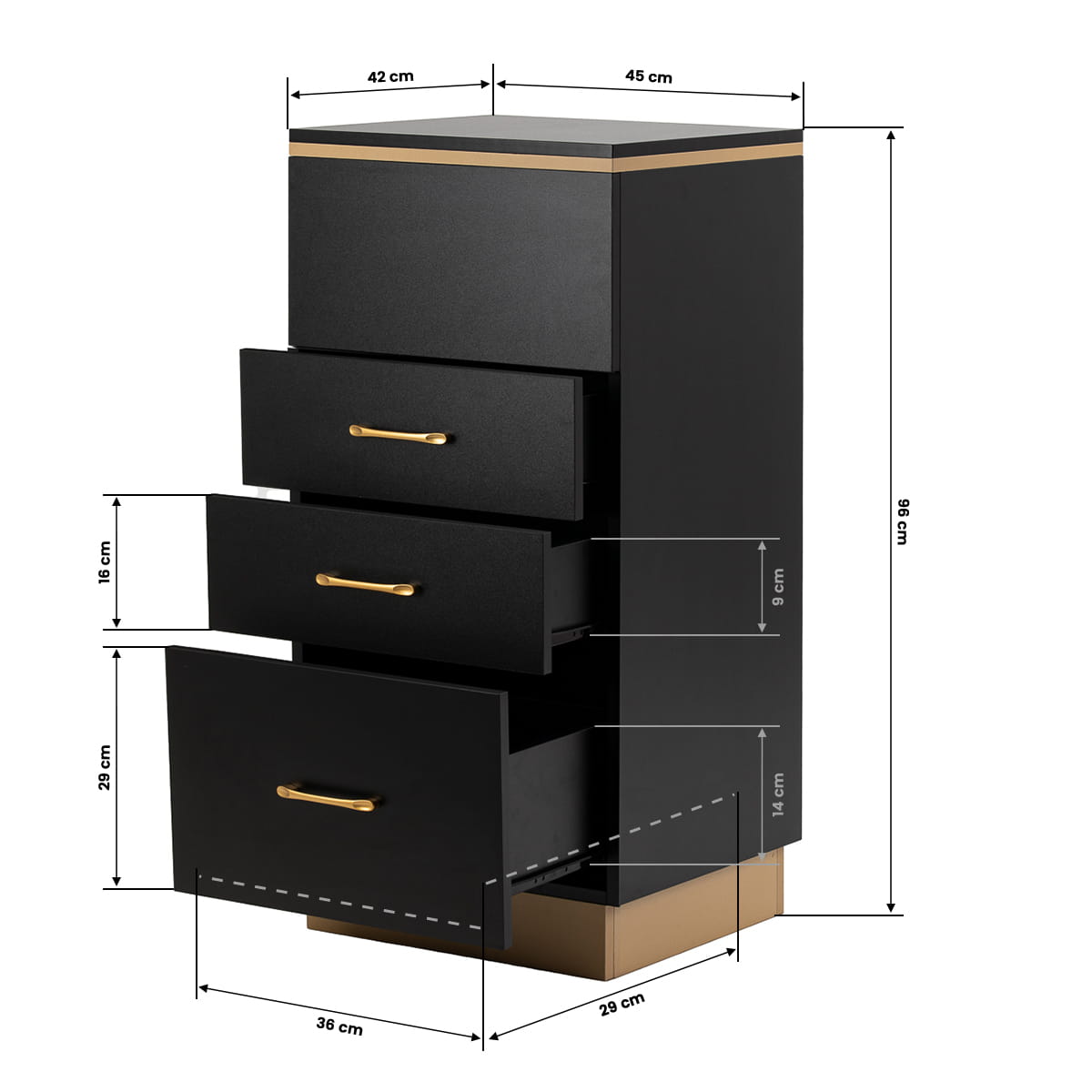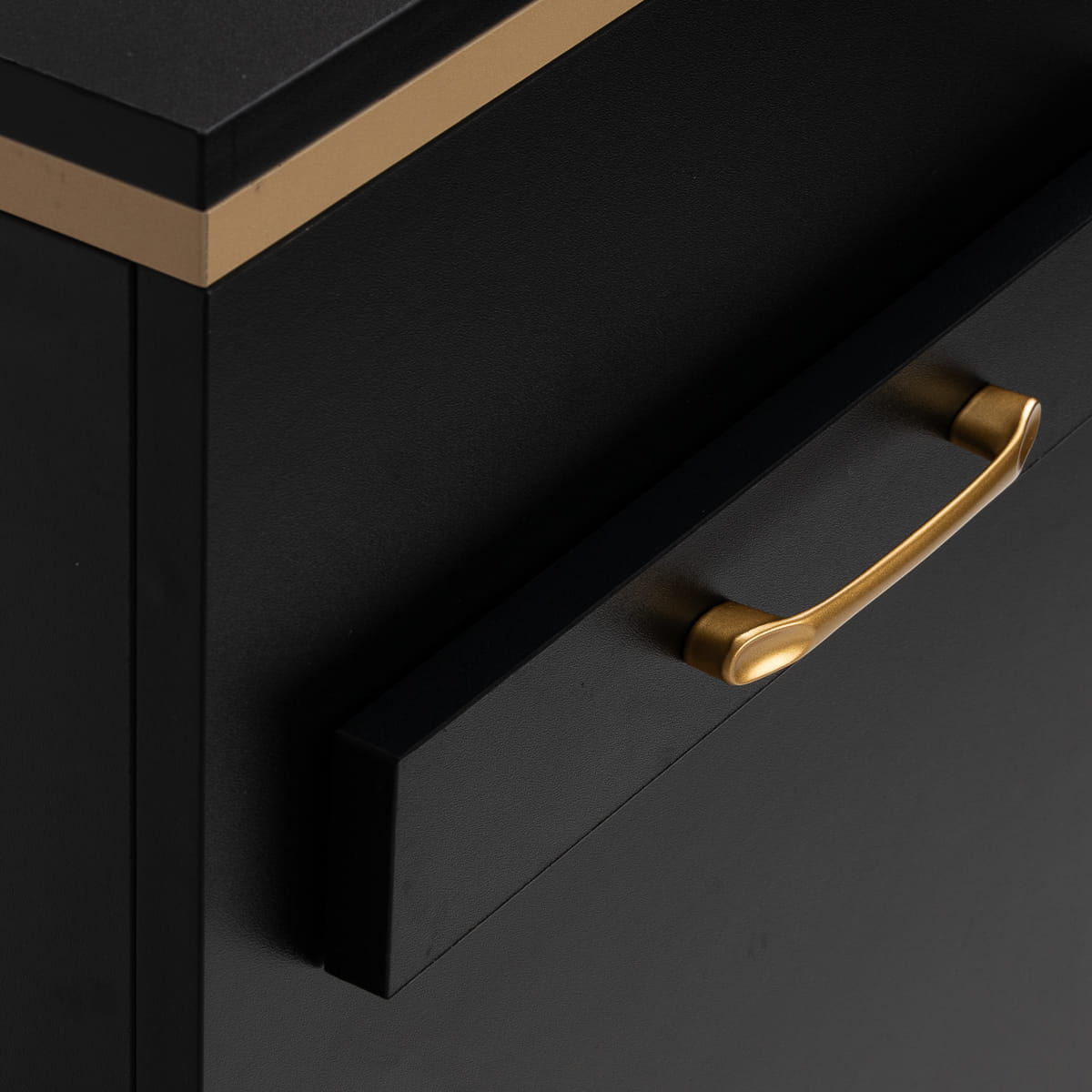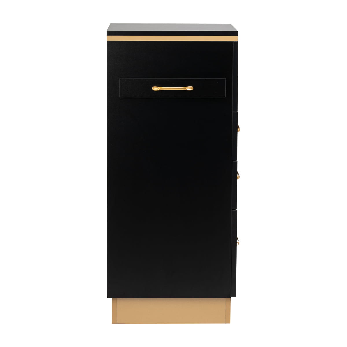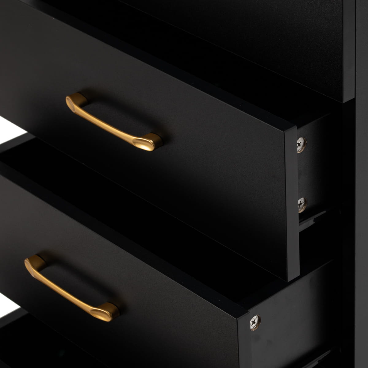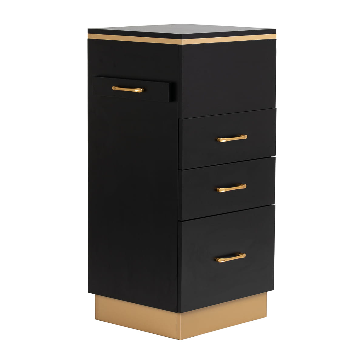 Zestawienie klasycznej czerni ze złotem nadaje pomocnikowi nowoczesnego, prestiżowego charakteru, który świetnie dopasuje się zarówno do minimalistycznych, jak i bardziej wyrazistych aranżacji. Solidna konstrukcja zapewnia stabilność, a gładka powierzchnia ułatwia utrzymanie mebla w czystości. Złote uchwyty nie tylko podkreślają elegancki design, ale także zapewniają wygodne otwieranie każdej z szuflad. To praktyczne rozwiązanie do salonu fryzjerskiego, w którym liczy się porządek, wygodny dostęp do narzędzi oraz estetyka stanowiska pracy.