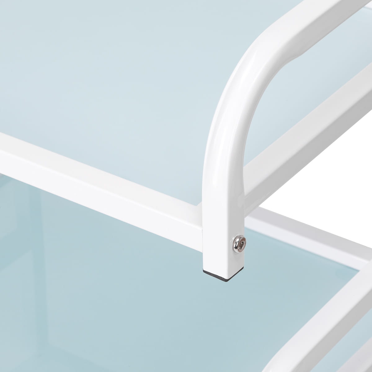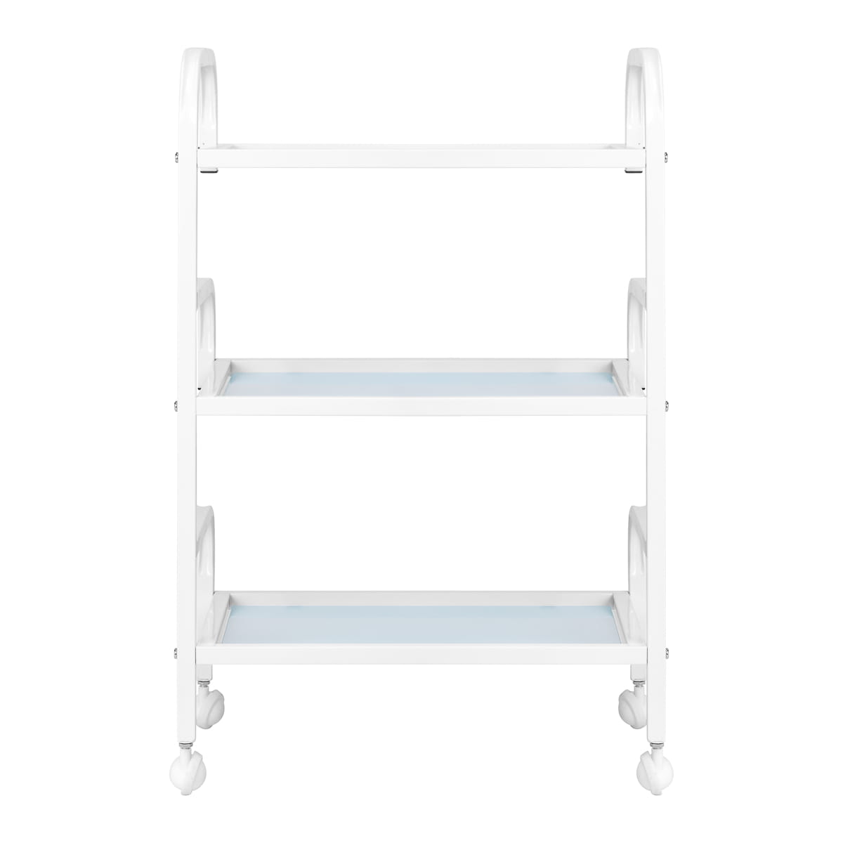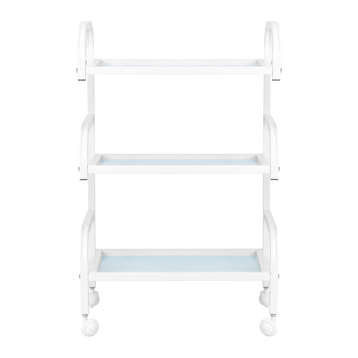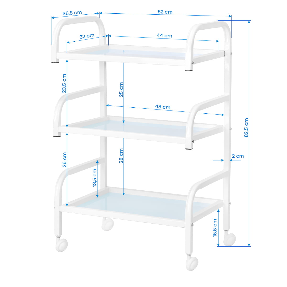 Stelaż z trwałego aluminium w odcieniach bieli oraz szklane półki tworzą nowoczesną i estetyczną całość, którą łatwo utrzymać w czystości. Cztery kółka zapewniają mobilność, co ułatwia organizację przestrzeni roboczej, a solidne materiały gwarantują stabilność i trwałość użytkowania.